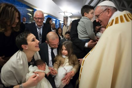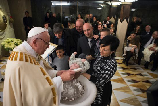 意大利1月14日下午,在梵蒂冈教宗住所“圣玛尔塔之家”(casa Santa Marta)的小堂里,在教宗方济各(Francesco) 的主礼下,13位意大利中部地震后灾区出生的婴儿受洗,他们中最小的出生只有5天。