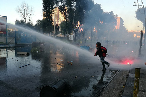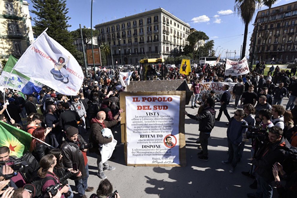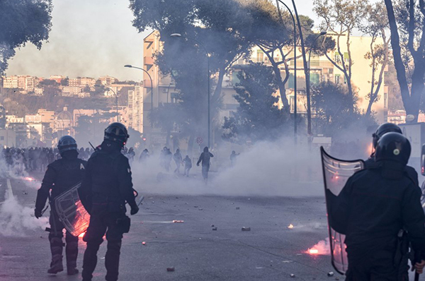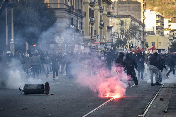 下午17时,突然有示威者向fuorigrotta区警察局周围投掷了两枚纸炸弹。警方立刻对正在召开北方联盟领导人会议的Oltremare会展中心附近街道进行封锁。随后,抵达会展中心的示威者与警方发生冲突,他们向警察投掷石块和爆炸物,警方使用催泪瓦斯和水枪驱散游行队伍。一段时间后暴乱又转移到Campi Flegrei火车站附近的Tecchio广场。这些示威者们头戴黑色头巾,手持木棍,不断投掷燃气瓶,场面十分危急。很多群众都受到惊吓躲进了附近的建筑物里面,不少商家都被迫关门。冲突持续了近一个小时,有3人被逮捕,3人被指控。34人受伤,其中有28名武警人员和6名示威者。