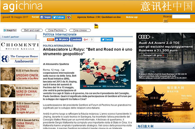 5月12日,意大利第二大通讯社意讯社(AGI)刊发对李瑞宇大使专访,李大使就“一带一路”倡议、中意关系等回答记者提问,主要内容如下:
