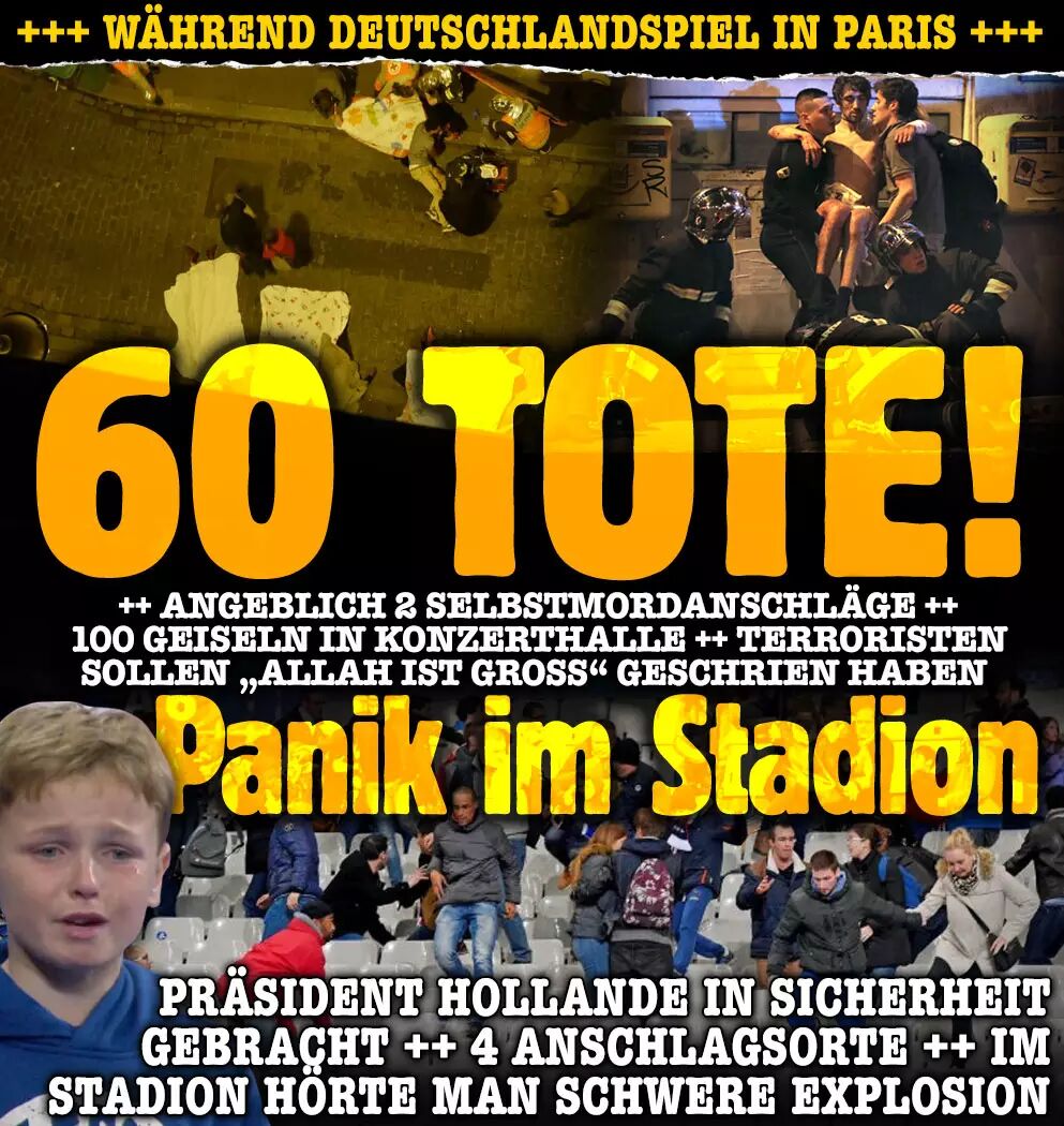 据德国媒体报道,今天晚上在巴黎正在举行的德国队对法国队的比赛时,发生了严重的恐怖袭击事件,目前已有多起枪击和炸弹袭击,已造成60人死亡。