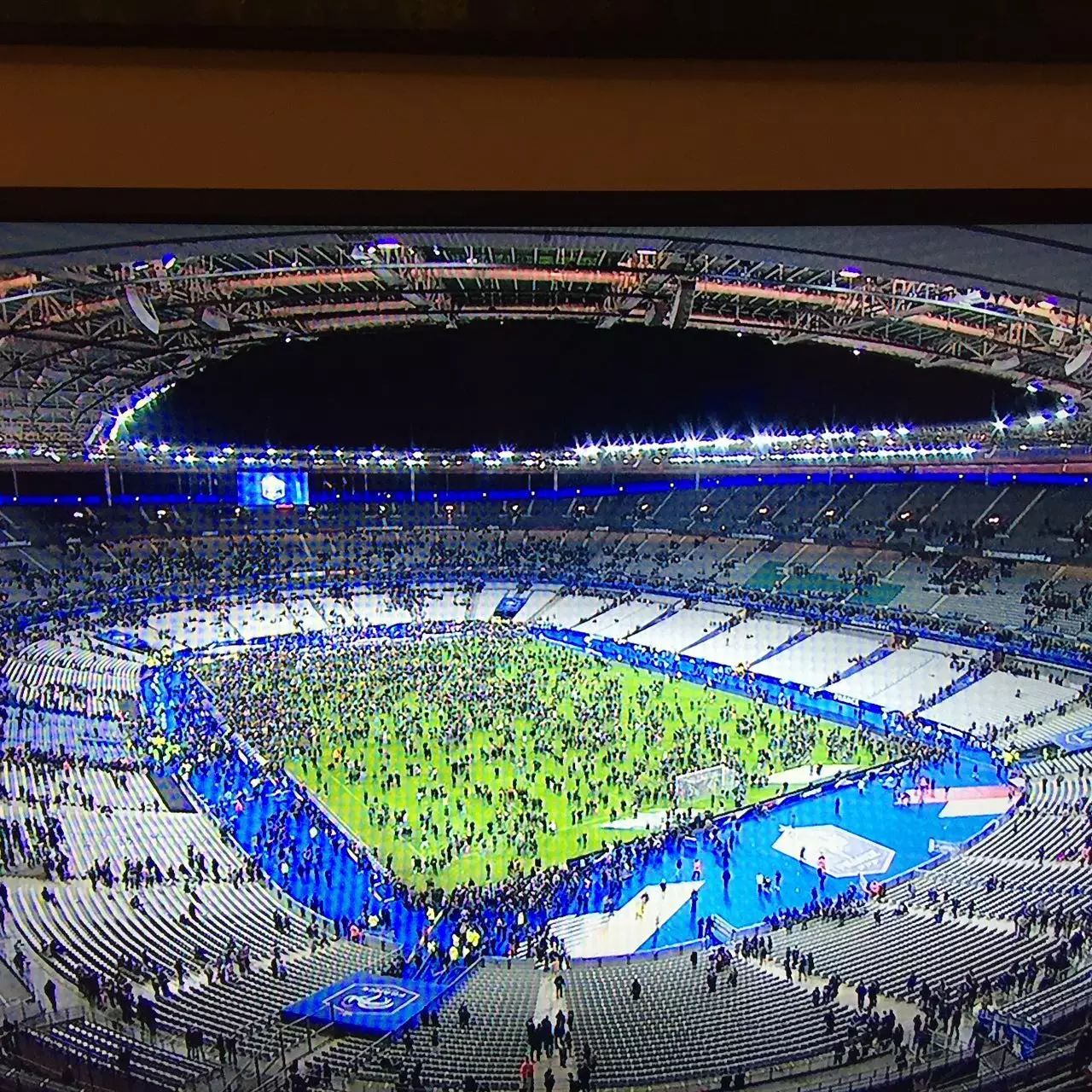 一名在法兰西体育场内的记者说,尽管赛场内球迷的呼喊声很大,他还是听到两声爆炸。
