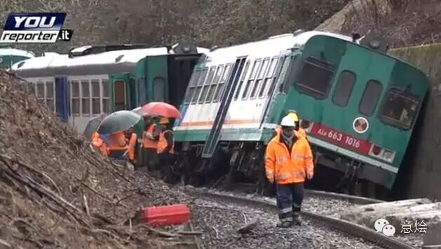 火车因滑坡驶出轨道,意铁路局工作人员正在清理事故火车。