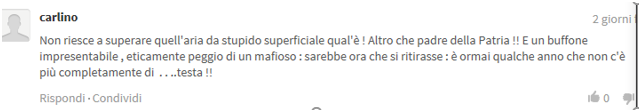 “事实就是,他的肤浅和愚蠢真的是改不了啊……还意大利国父呢,纯粹一个上不了台面的小丑,甚至黑手党都比他有道德!我看他还是赶紧下台吧,他这么没脑子已经不是一两年了……”