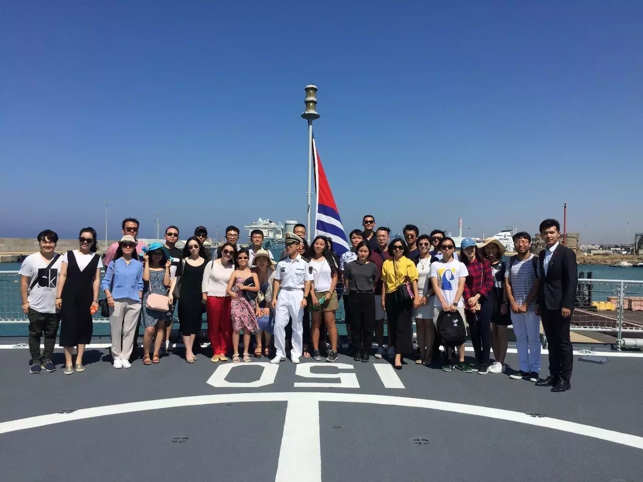(旅意留学生代表参观军舰并合影留念,图片由李秦鹏提供)