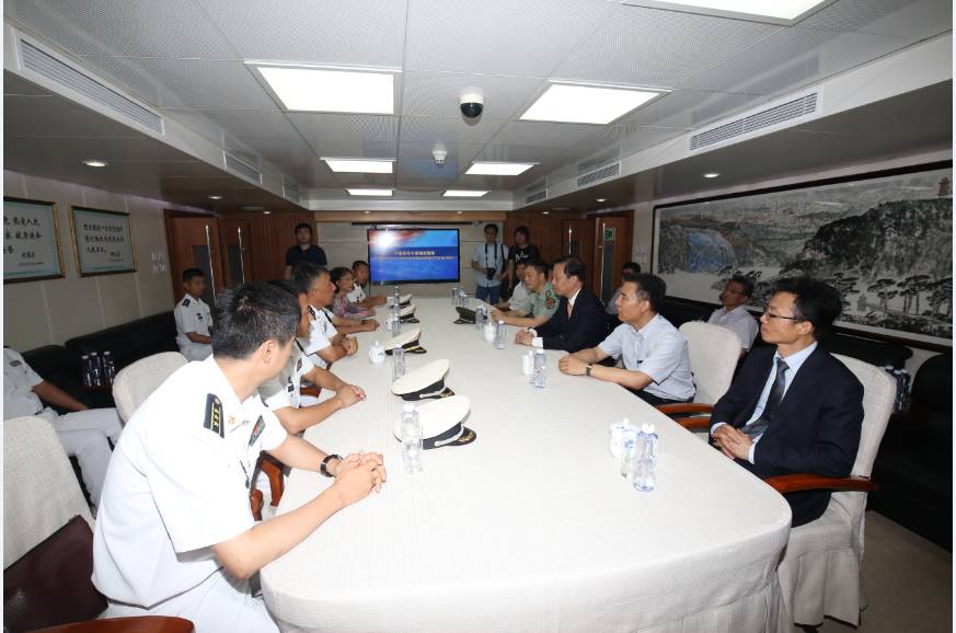 (编队官兵向登舰参观的来宾介绍长春舰的装备)