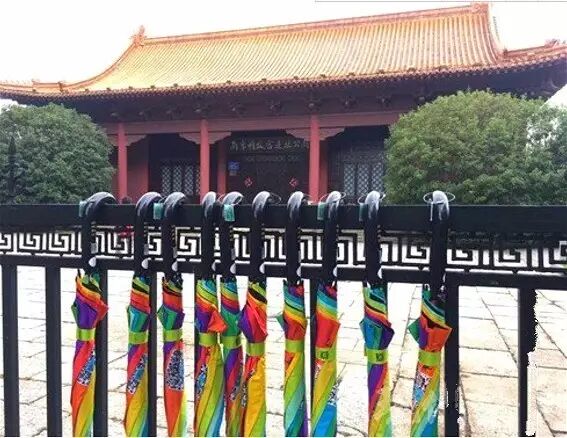 这不,就在前天,南京街头突然涌现出了近万把彩虹雨伞,全身都是靓丽的彩虹色,挂在街边的栏杆上,看着就很吸睛。
