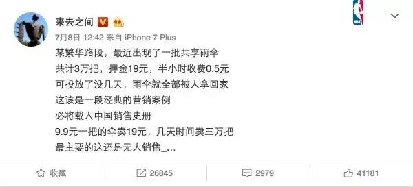 “9.9元一把的伞卖19元,几天时间卖3万把,最主要的这还是无人销售。“这应该是一段经典的营销案例,必将载入中国销售史册。”