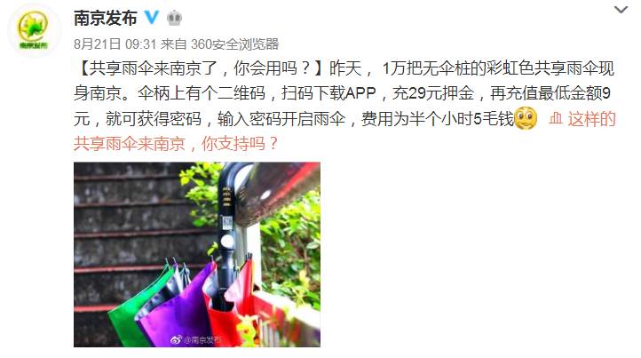 就着南京上周末投放了首批共享雨伞,组长带你一探究竟。