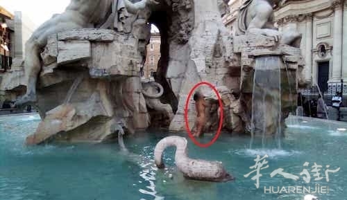 简讯报道:01月24日下午5点左右在Roma(罗马)的Piazza Navona广场的一处喷泉里,一名女子赤身裸体在里面洗澡游泳被警察逮捕。