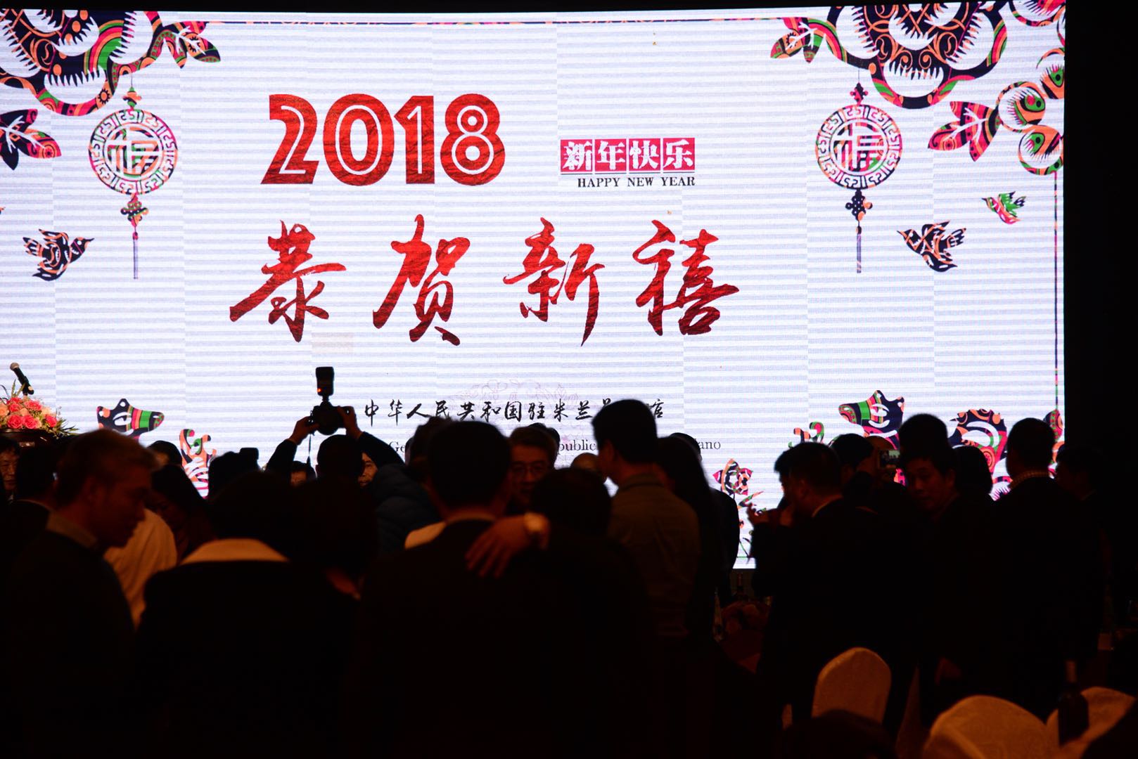 意大利《华人街》消息:2018年2月8日晚间,中国驻米兰总领馆在米兰新希尔美食城大酒店隆重举行迎新招待会,中国驻米兰总领馆总领事宋雪峰、副总领事黄永跃、汪惠娟带领全体馆员与领区的华侨华人、中资企业、留学生等代表450多人喜迎2018年春节。