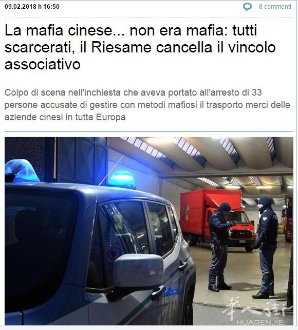 那个曾经在普拉托从事垄断全欧洲华人汽车货运行业的不是华人黑帮。再审法庭(Tribunale di Riesame)排除了黑社会组织的指控,25名在佛罗伦萨反黑组进行的China Truck行动中被捕的人都被释放出狱。有些直接释放,有些转为家里监禁或按时签到,其中有很多人之前被指控的罪名都是涉及黑社会组织。根据警方持续六年的调查结束后,签发了33张监狱收押令,并于1月18日清晨展开行动,25人被抓捕入狱。而所谓的组织首脑也已经于2月9日从监狱里释放被带回他位于罗马的住家里带电子拷撩收押。